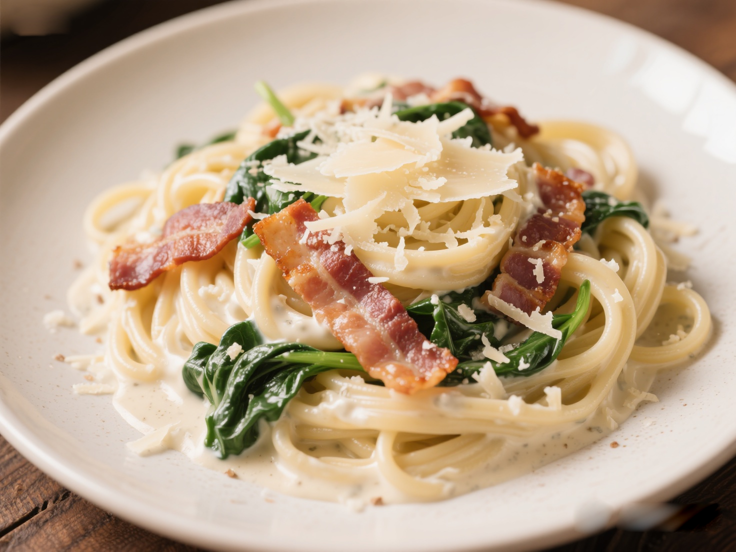 特點(diǎn):培根的煙熏咸香與奶油的醇厚完美融合,菠菜增添清新口感。