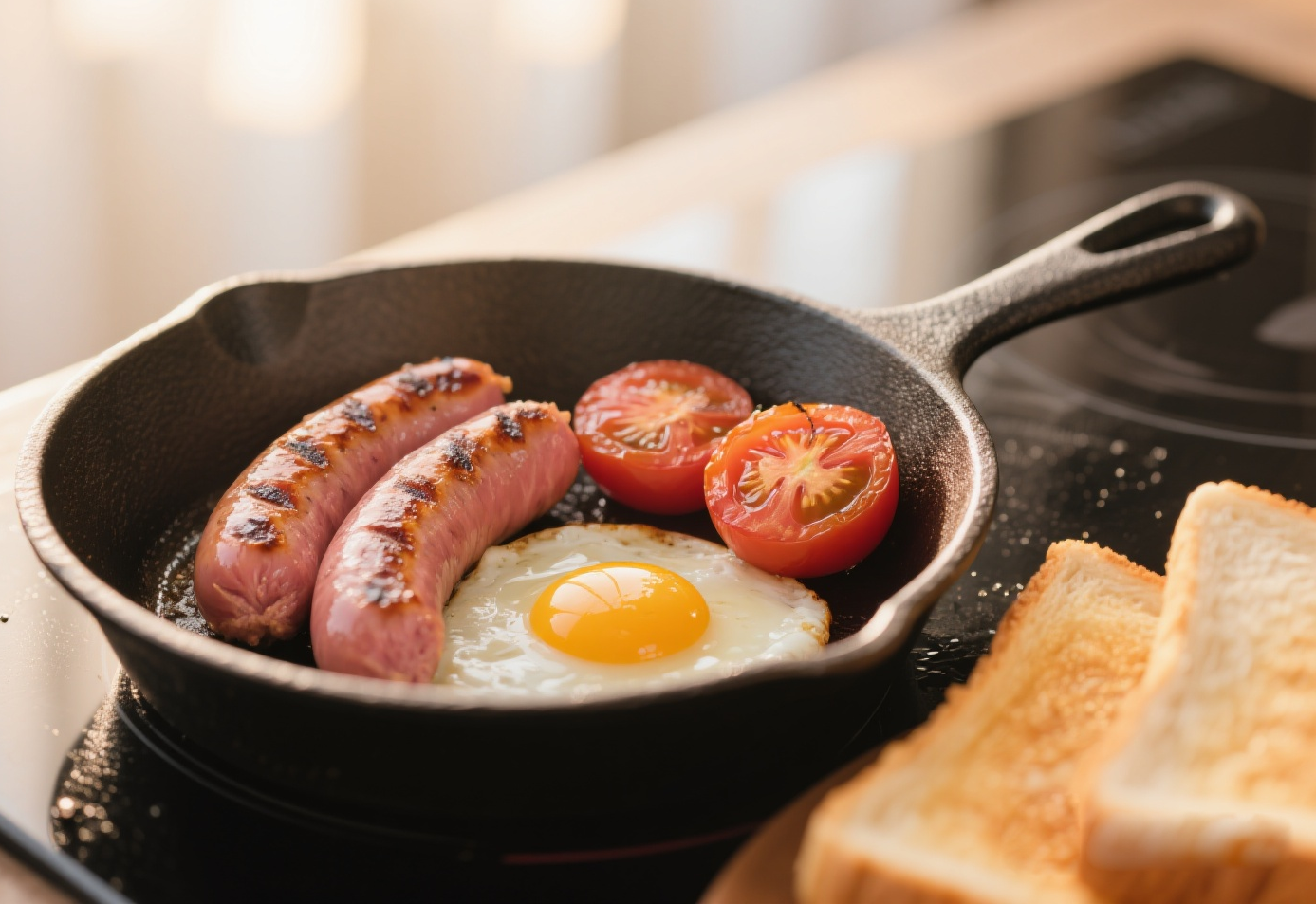 特點(diǎn):充分激發(fā)牛肉腸的焦香風(fēng)味,搭配太陽蛋和烤番茄,打造營養(yǎng)均衡的經(jīng)典西式早餐。