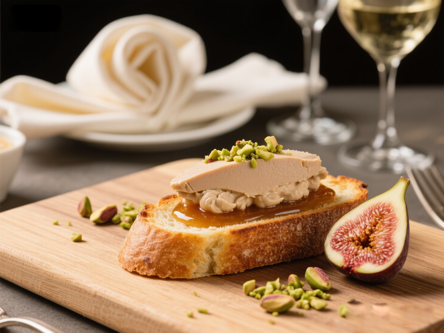 ⑤ 擠上鵝肝慕斯,點綴無花果醬,撒開心果碎。